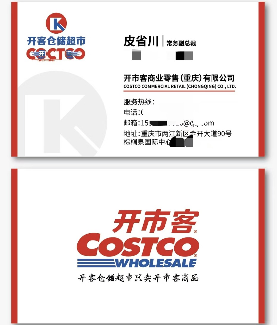 此人员给到任齐的名片自称叫“皮省川”,为“开市客商业零售(重庆)有限公司”常务副总裁。此外,提供的营业执照为“开市客商业零售(重庆)有限公司”,法人胡爱发。