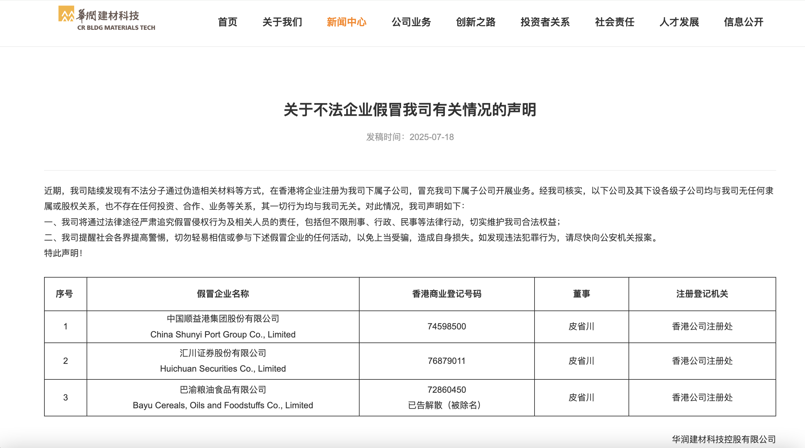 华润建材科技控股有限公司也在官网发布声明,与“中国顺益港集团股份有限公司”等公司无关。