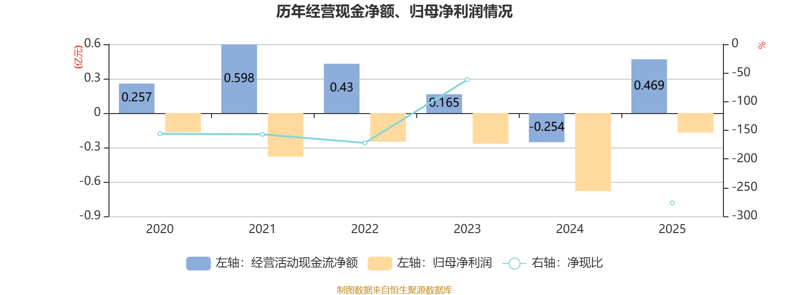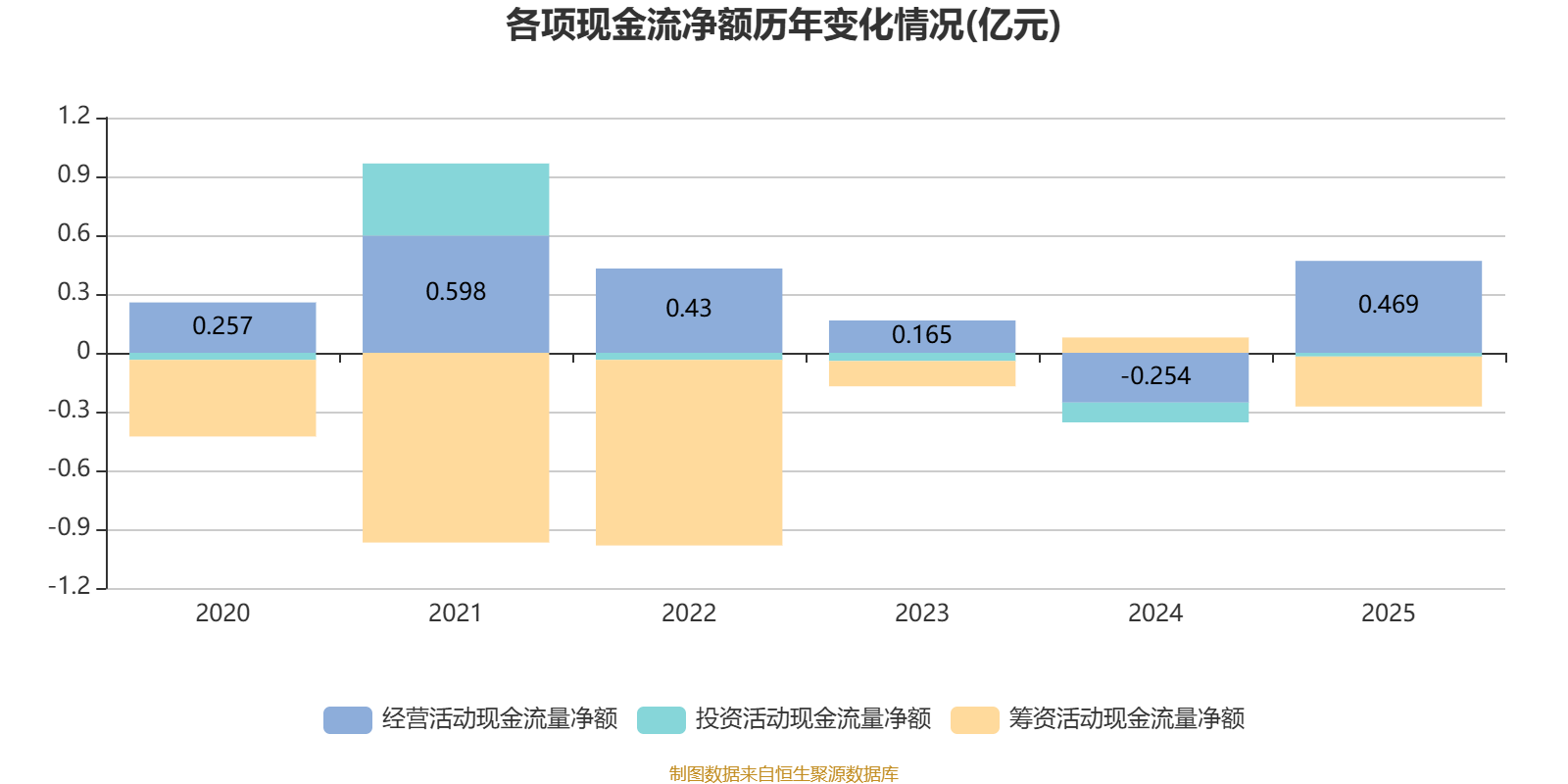 2025年,公司经营活动现金流净额为4694.4万元,同比增加7232.4万元;筹资活动现金流净额-2553.4万元,同比减少3331.4万元;投资活动现金流净额-194.2万元,上年同期为-1007.2万元。