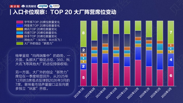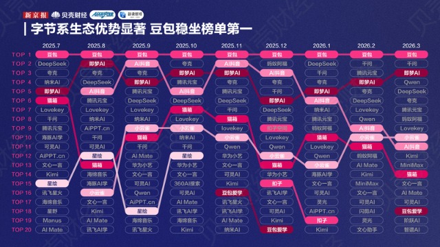 一个最直观的观察窗口,是“全媒介之星”中国AI应用榜单。自2025年7月至2026年3月,该榜单已连续发布9期。从榜单变化来看,AI应用的市场声量分布呈现出向两端集中的趋势:一端是字节跳动、阿里巴巴等头部大厂持续强化优势,另一端是大厂之外的创企“新势力”明显回升,而处于中间位置的“腰部”厂商产品,正在面临更为明显的挤压。