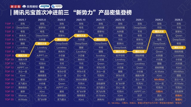 与之对应,大厂外创企“新势力”在榜单上占据的席位数量,也从2025年12月的3席回升至2026年3月的7席。这一变化,一方面与模型能力和产品创新带来的自然抬升有关,另一方面也反映出,在大厂加速挤压之下,独立AI公司同样在主动加大投入,把握一季度的高热度窗口进入公众视野。