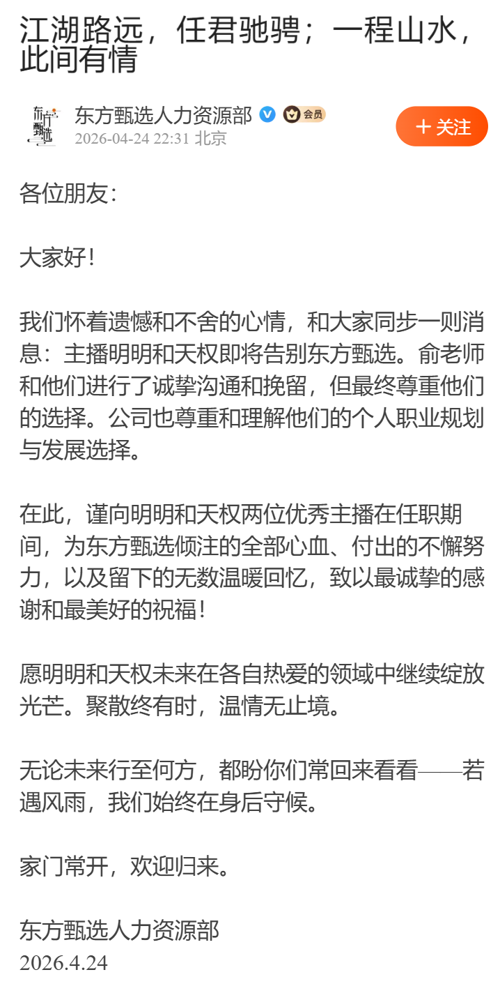 此前一天,东方甄选人力资源部发布公告,宣布明明和天权即将告别。公告称:“我们怀着遗憾和不舍的心情,和大家