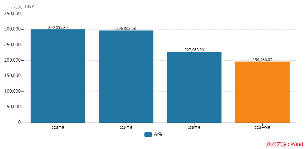 公司存货在明显下降。2025年末存货22.80亿元,较年初下降约23%;2026年一季度末存货再降至19.65亿元,降幅约14%。