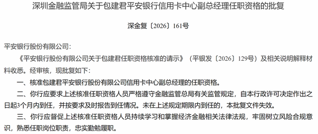 4月24日,国家金融监督管理总局深圳监管局发布的批复公告显示,核准包建君平安银行股份有限公司信用卡中心副总经理的任职资格。
