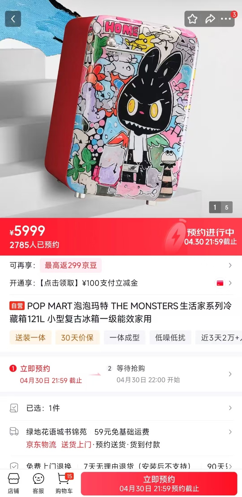 【大河财立方消息】近日,泡泡玛特推出The Monsters生活家系列冷藏箱家电,据悉,此次共推出两款产品,分别为Home和House of the Monsters,统一售价5999元,4月30日晚上10点正式开抢,全球限量发售999台。截至发稿时间,记者注意到,京东平台的预约人数为2785人。
