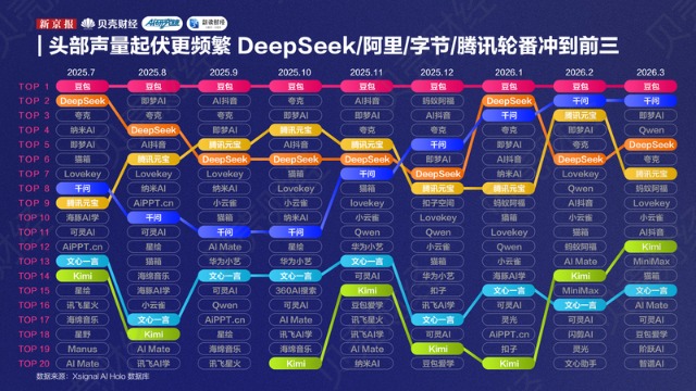 自去年7月到今年3月,新京报AI研究院与Xsignal联合推出的“全媒介之星”榜单已连续发布9期。从这9期榜单来看,一个比较明显的变化是,榜单上的席位正在向两端集中:一端是头部大厂继续做大,另一端是大厂外的创企“新势力”明显回升,而“腰部”厂商AI应用的声量则在被进一步挤压。