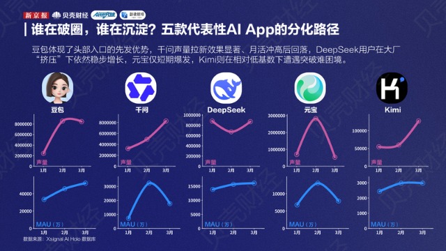 从3月的声量与月活数据来看,AI应用的头部格局已经初步形成——豆包、千问、DeepSeek、夸克、元宝五款产品在两项指标上都明显领先于其他应用。