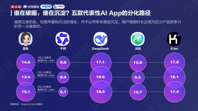 Kimi则更接近“平台期产品”。其声量虽在3月有所回升,但绝对值仍不高;MAU从2431.4万增至2970万后基本趋稳,人均单日使用时长始终维持在17至18分钟之间,表现出相对稳定的用户黏性。