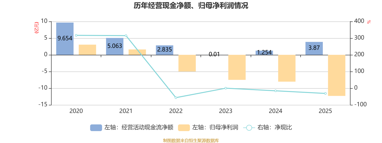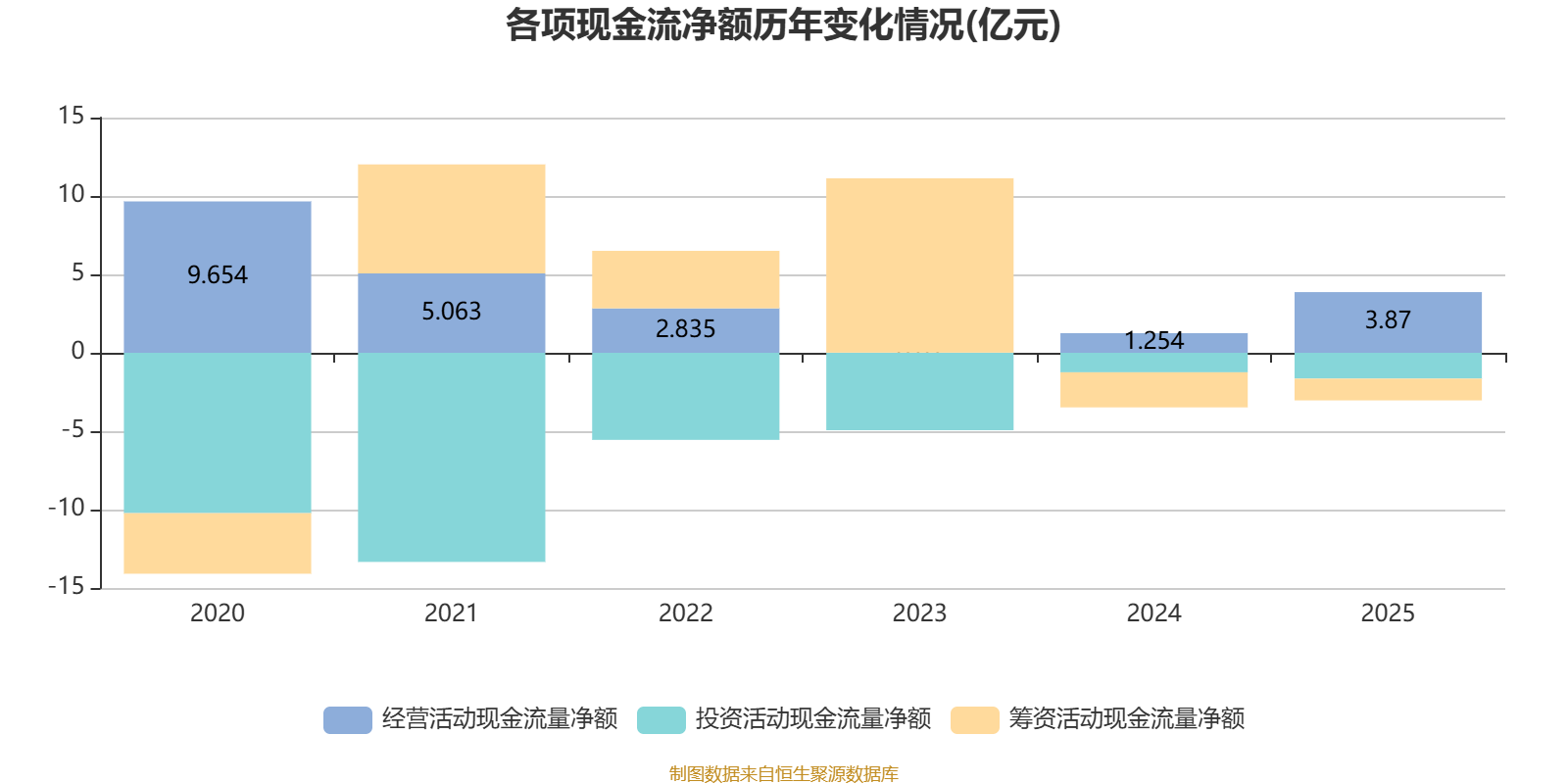 2025年,公司经营活动现金流净额为3.87亿元,同比增长208.59%;筹资活动现金流净额-1.39亿元,同比增加8469.96万元;投资活动现金流净额-1.65亿元,上年同期为-1.24亿元。