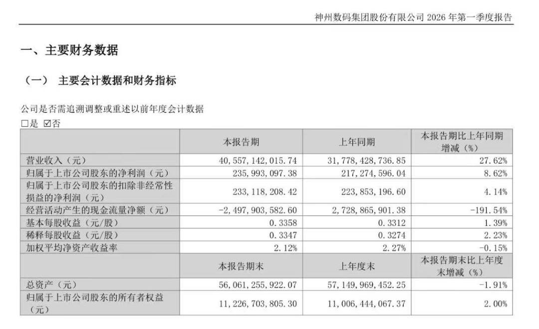 4月27日晚间,神州数码集团(000034.SZ)发布2026年第一季度经营业绩。报告期内,神州数码整体营业收入实现405.6亿元,同比增长27.6%;归母净利实现2.4亿元,同比增长8.6%,毛利额同比增长15.3%;其中,AI相关业务收入实现约155亿