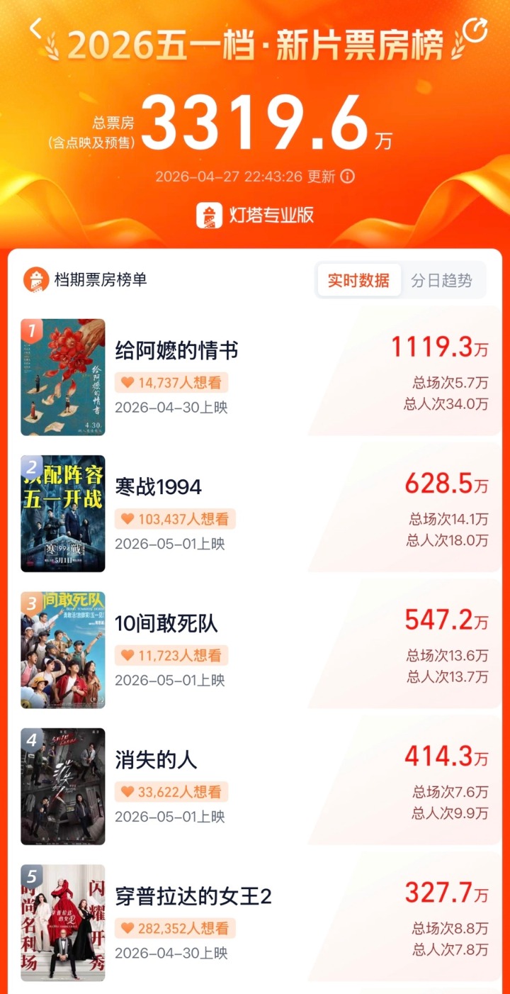 《穿普拉达的女王2》作为进口大片,将于4月30日抢先上映,梅丽尔·斯特里普、安妮·海瑟薇、艾米莉·布朗特等原班人马时隔20年全员回归。对于看着第一部长大的观众来说,能看到“米兰达”和“安迪”再次同框,本身就是最大的看点。虽然目前尚未开启大规模公映点映,不过影片已于4月10日在上海举办了盛大的中国首映礼,从小范围反馈来看,新作不仅依旧是时尚界的视觉盛宴,更仍是职场人的共鸣之作。续集设定了非常有趣的“地位互换”,面对数字时代下时尚行业的变革,米兰达不得不向已成为奢侈品高管的艾米丽求助,而安迪也以资深记者身份回归。尤其,观众对梅姨的演技评价依旧极高。不过,《穿普拉达的女王2》虽在淘票票上以28 万“想看”热度断层领先,但截至27日中午预售票房仅位列五一档第五,情怀热度与实际购票意愿的错位现象同样值得关注。