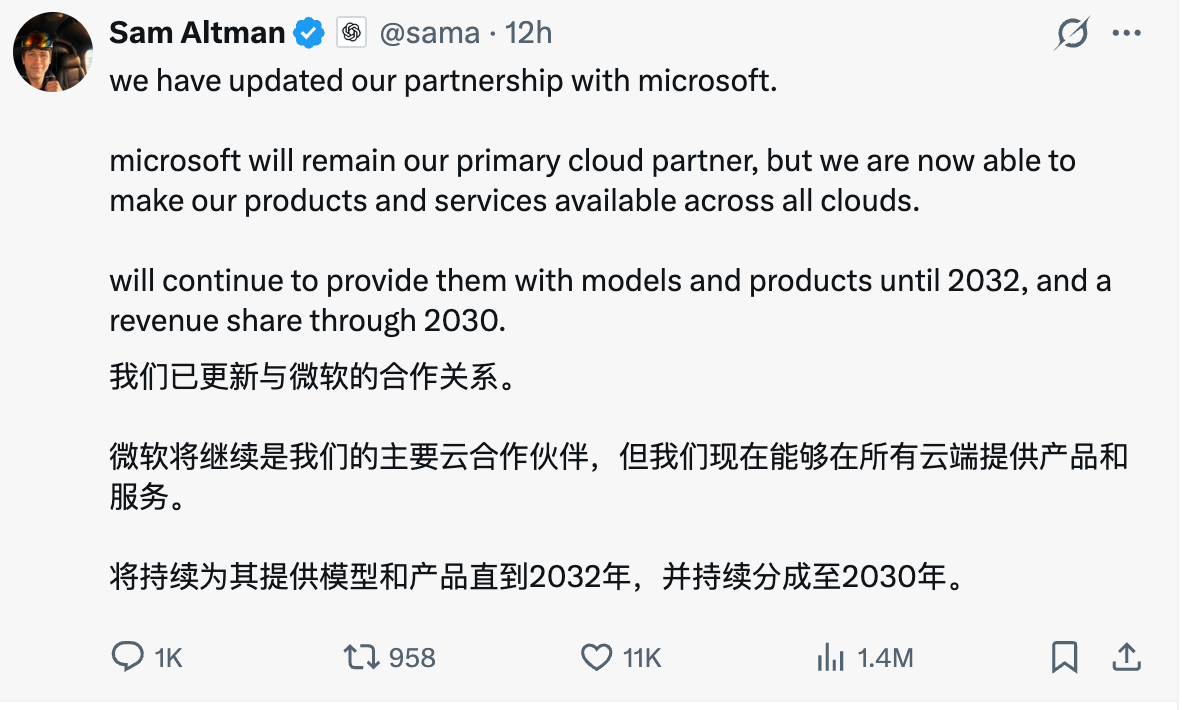 具体来看,微软未来仍是主要云合作伙伴,OpenAI产品将优先在微软云Azure上推出,但彻底取消过去的独家云限制,OpenAI可以在任意云平台提供产品与服务。