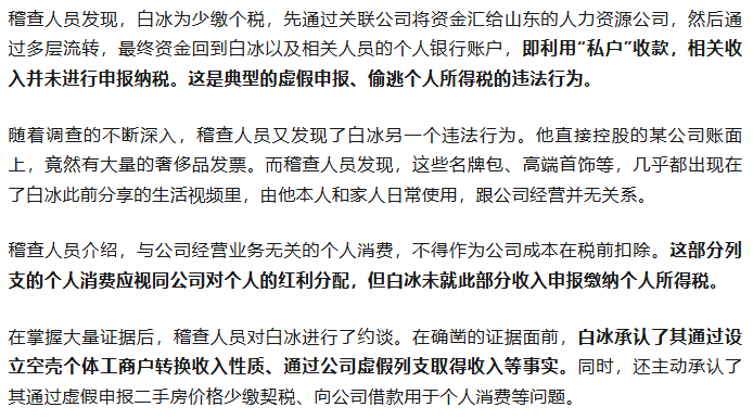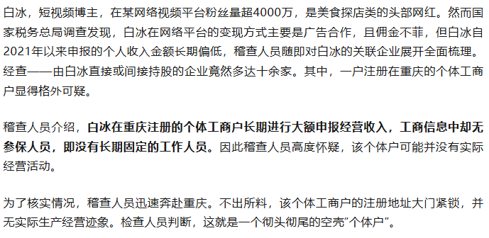 据国家税务总局4月28日消息,近期,国家税务总局根据税收大数据分析,依法查处“探店”网红白冰偷税案件。经查,白冰在2021年至2024年期间通过转换收入性质、虚假申报等方式,少缴个人所得税、增值税、契税等税费共计911.18万元。2025年10月,国家税务总局依据相关法律法规规定,对其作出追缴税费款、加收滞纳金并处罚款共计1891.24万元的处理处罚决定。目前,涉案税费款、滞纳金及罚款已全部追缴入库。