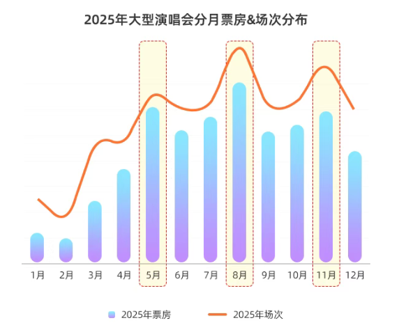 大型演唱会市场高速增长,4月起持续保持高位运行。2025年举办大型演唱会2496场,产出票房295.58亿元,同比增长13.7%,观演人次近3800万,较上年增长30.8%,市场持续快速扩张。