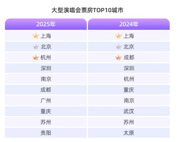 2025年,沿海地区省份是举办大型演唱会的热门区域,广东、上海、浙江、北京、江苏、福建、四川、山东票房突破10亿元,贵阳首次进入大型演唱会城市票房前十。57.4%的大型演唱会单场观演人数超过1万人,同比2024年增长14.9%,头部项目集聚效应持续强化,规模化特征显著。