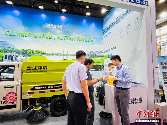 在盈峰环境展位,一台“2吨小精灵洗扫车”吸引不少境外采购商驻足。这款纯电动洗扫车整车宽度小于1.2米,是同级别中最窄的车型之一,能够在背街小巷、人行步道等狭窄区域自由穿行。在能耗方面,该公司首创的“龙卷风”风机让这款洗扫车整车作业能耗低至0.6度电/公里。