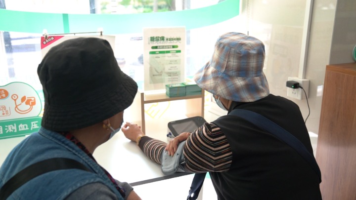 在上海市国和路益丰大药房门口,“健康驿站”的标识格外醒目。进门处的服务专区,茶水、微波炉、爱心雨伞、血压计等设备整齐摆放。靠窗的休息区里,几位老年居民正在服务台前测量血糖,药师在一旁耐心讲解慢性病早防知识。
