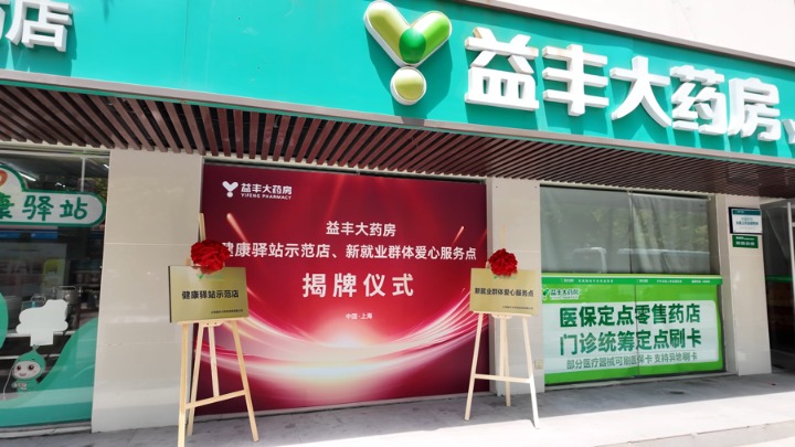 在上海市国和路益丰大药房门口,“健康驿站”的标识格外醒目。