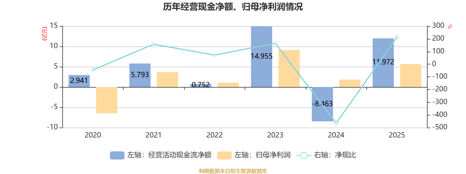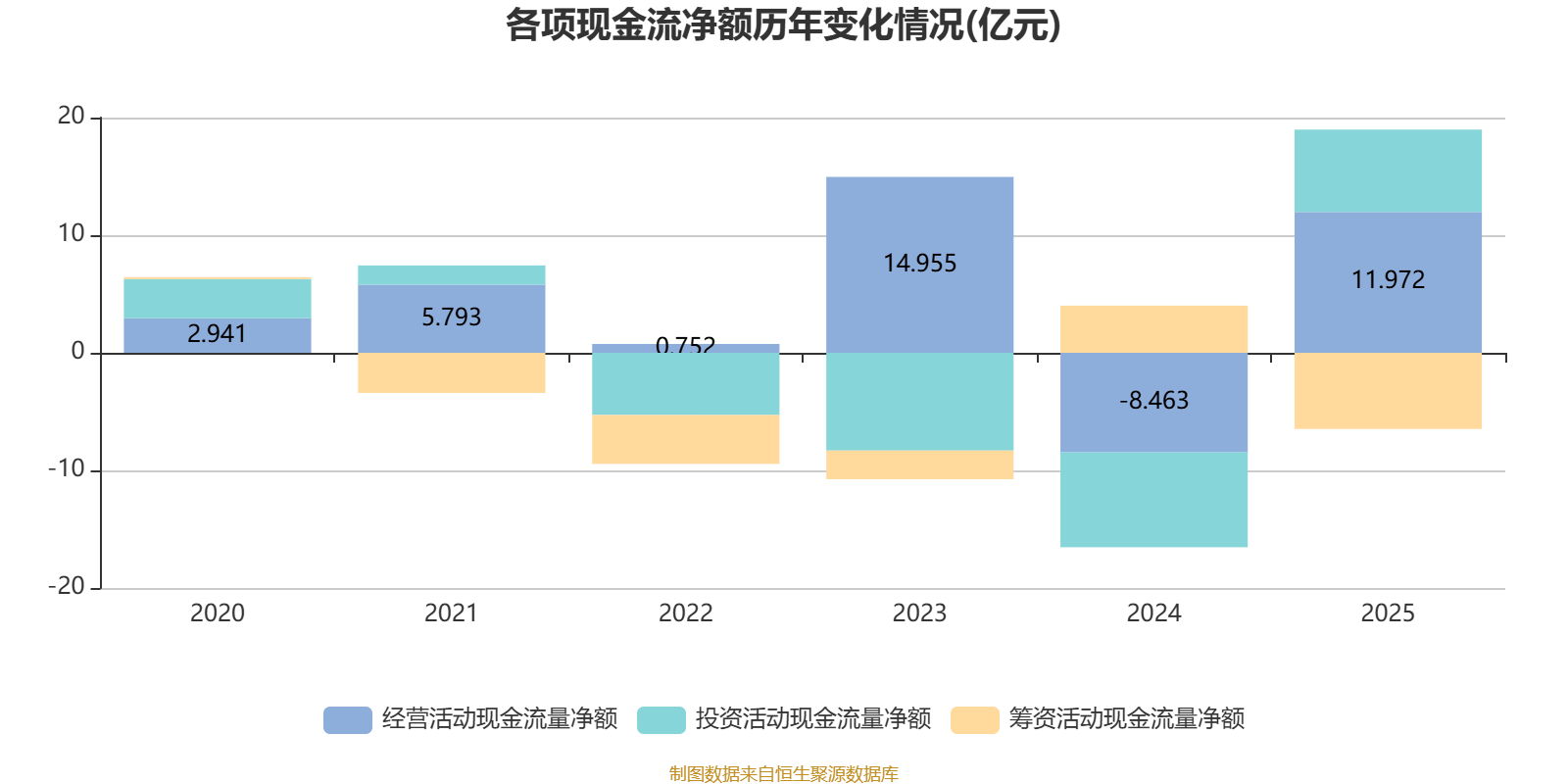 2025年,公司经营活动现金流净额为11.97亿元,同比增加20.44亿元;筹资活动现金流净额-6.47亿元,同比减少10.48亿元;投资活动现金流净额7.01亿元,上年同期为-8.07亿元。