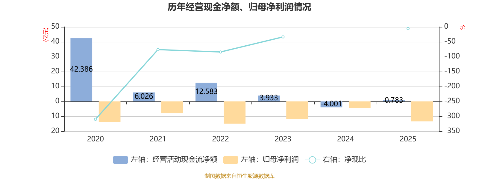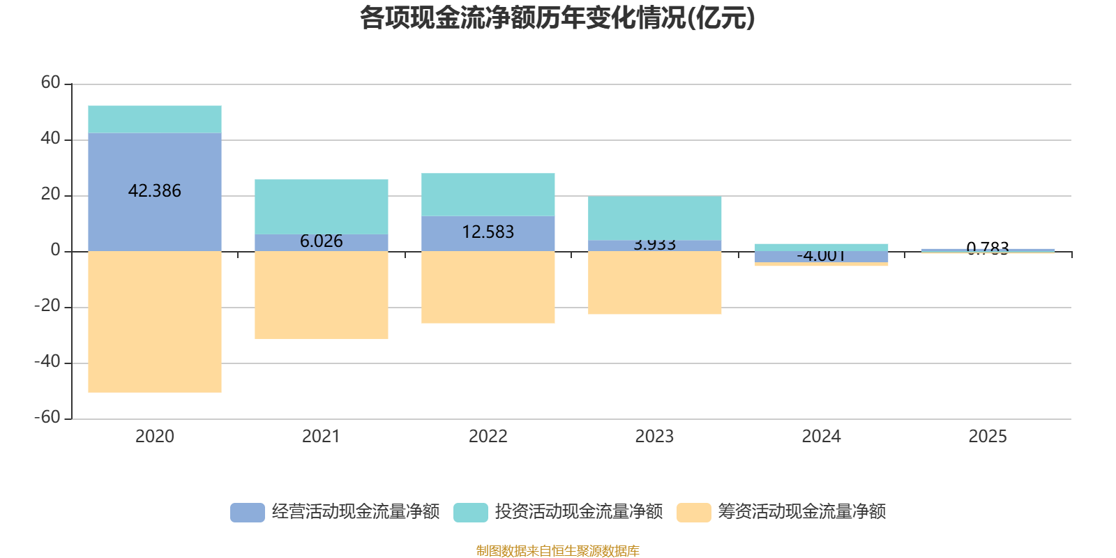 2025年,公司经营活动现金流净额为7828.7万元,同比增加4.78亿元;筹资活动现金流净额-3988.8万元,同比增加8919.7万元;投资活动现金流净额-4465万元,上年同期为2.57亿元。