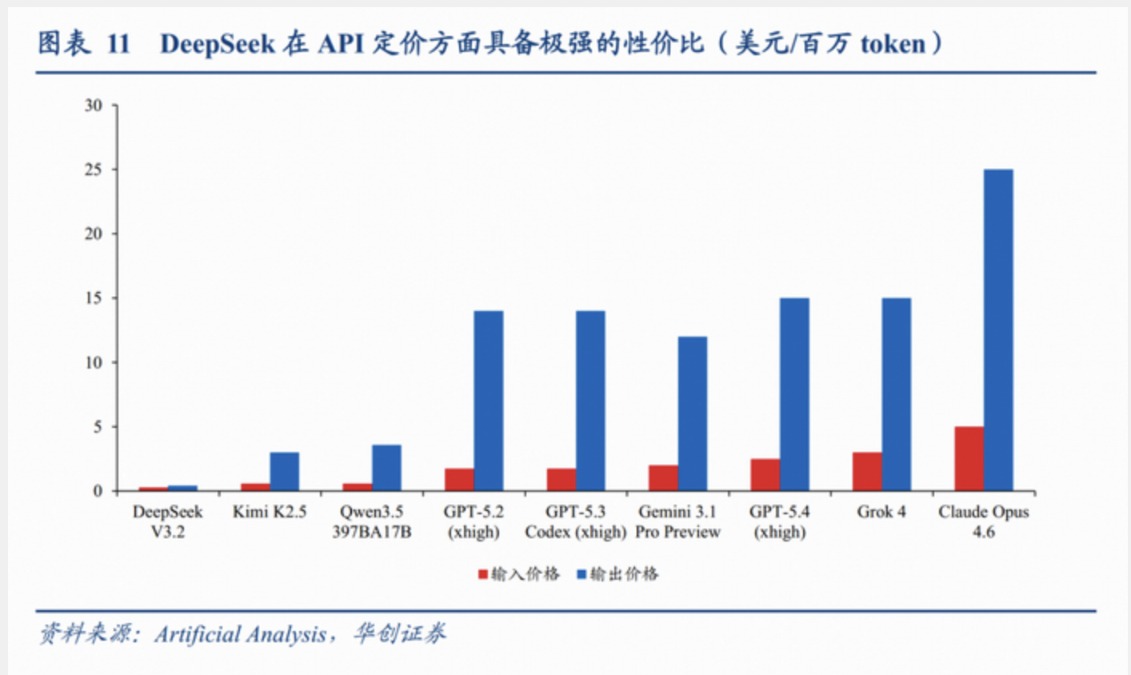 不同大模型API定价对比,DeepSeek V3.2的输入/输出价格低于GPT-5.2、Claude Opus等国际模型,具备极强的性价比。图片来源:华创证券
