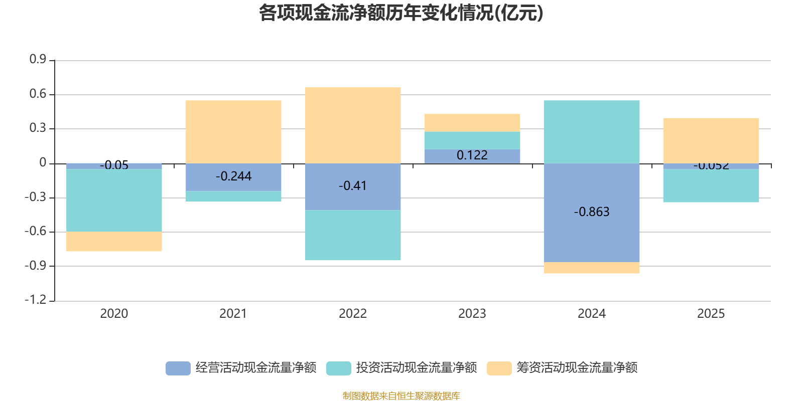 2025年,公司经营活动现金流净额为-522.2万元,同比增加8111.6万元;筹资活动现金流净额3937.6万元,同比增加4918.4万元;投资活动现金流净额-2882.8万元,上年同期为5485.6万元。