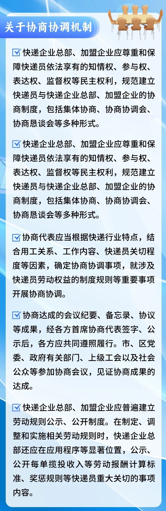 为切实守护快递员等新就业群体的合法权益,上海市总工会联合市邮政管理局、市快递行业党委,指导市快递行业工会、市快递行业协会探索市级行业协商恳谈机制,聚齐邮政、顺丰、京东物流、中通、圆通、申通、韵达、极兔、