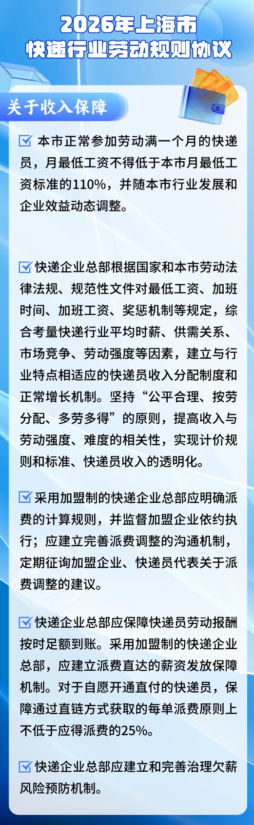 为切实守护快递员等新就业群体的合法权益,上海市总工会联合市邮政管理局、市快递行业党委,指导市快递行业工会、市快递行业协会探索市级行业协商恳谈机制,聚齐邮政、顺丰、京东物流、中通、圆通、申通、韵达、极兔、德邦,共9家头部快递企业,召开2026年上海市快递行业协商恳谈会,会上形成本市首份《2026年上海市快递行业劳动规则协议》,协议将覆盖全市超10万名快递员。