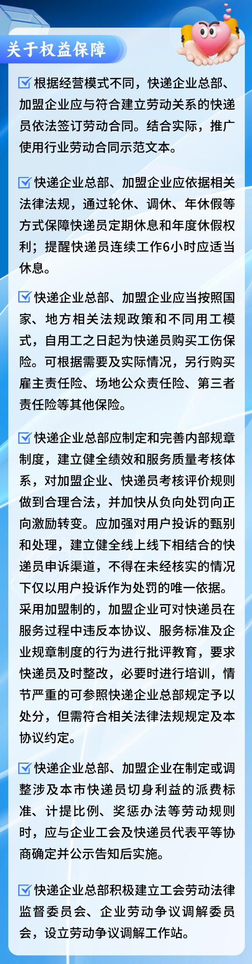 在权益保障方面,《协议》明确快递企业总部、加盟企业根据经营模式不同,与符合建立劳动关系的快递员依法签订劳动合同;通过轮休、调休、年休假等方式保障快递员定期休息和年度休假权利;快递企业不得在未经核实的情况下仅以用户投诉作为处罚依据,并加快向正向激励转变;涉及快递员切身利益的劳动规则调整,应经过平等协商、公示等民主程序。
