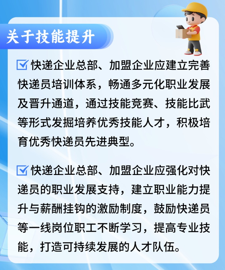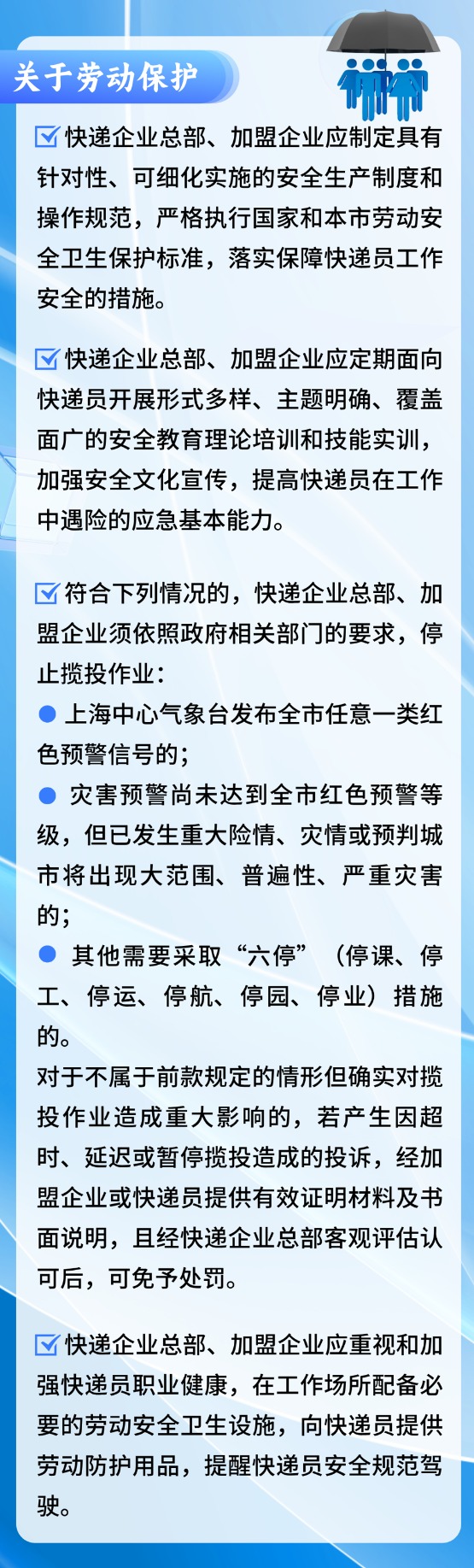 在劳动保护方面,要求快递企业总部、加盟企业应定期组织开展安全培训、在工作场所配备劳动安全卫生设施,向快递员提供劳动防护用品等;建立极端天气停止揽投作业和免予处罚机制。