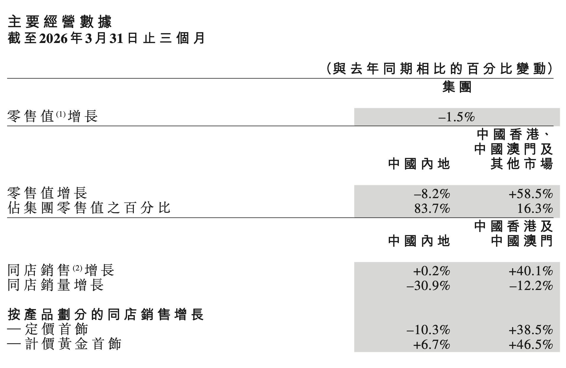 头部品牌数据,直观还原消费变迁。截至2026年3月31日,周大福在内地的零售值同比下降 8.2%,同店销量大幅下滑 30.9%;但内地的计价黄金首饰销售额逆势增长6.7%。品牌单品客单价显著抬升,内地计价黄金首饰同店平均售价升至11900 港元,去年同期仅7800港元。