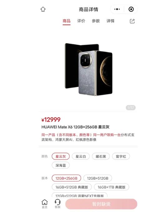 据华为全球旗舰店现场反馈,Mate X6上市即售罄,消费者需预约购买。线上华为商城同样火爆,开售后迅速被抢购一空,所有型号均显示缺货。