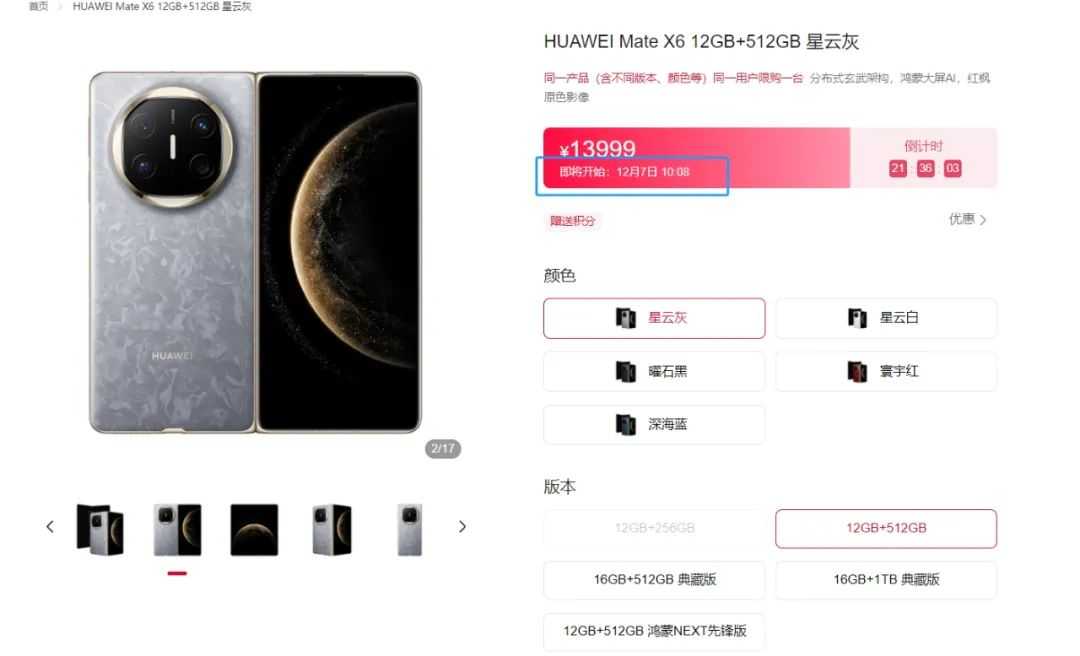 此次Mate X6系列包括12GB+256GB、12GB+512GB、16GB+512GB典藏版、16GB+1T典藏版、12GB+512GB鸿蒙NEXT先锋版五款配置,售价从12999元至15999元不等,星云灰、曜石黑、星云白、寰宇红和深海蓝五色可选。