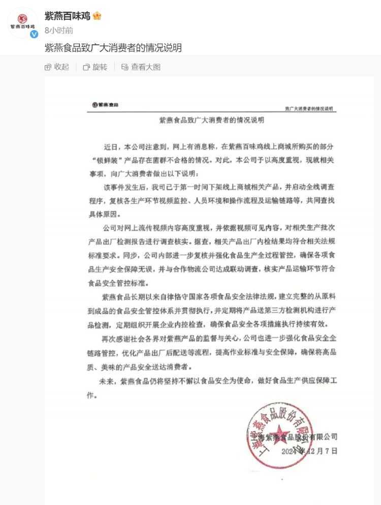 当天,紫燕食品通过其官方微博发布《紫燕食品致广大消费者的情况说明》称,公司注意到网上有消息称,紫燕百味鸡线上商城所售的部分“锁鲜装”产品存在菌群不合格问题。但经核查,相关产品出厂时的内检结果均符合相关法规标准要求。