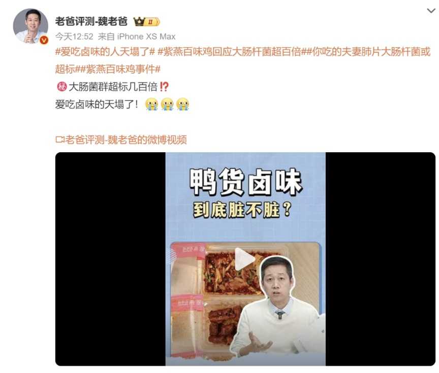 此前,测评博主“老爸评测”发布的检测报告显示,紫燕百味鸡的五个产品微生物检测结果不符合标准,最高超标达290倍。这一消息迅速冲上微博热搜。