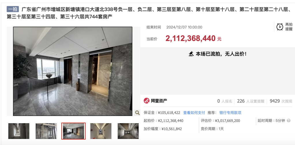 12月9日,广州增城区新塘镇凯达尔枢纽国际广场744套房产因无人竞拍而流拍,涉及商业、酒店和办公用途,标的物参考市场价约30.17亿元,起拍价约21.12亿元。