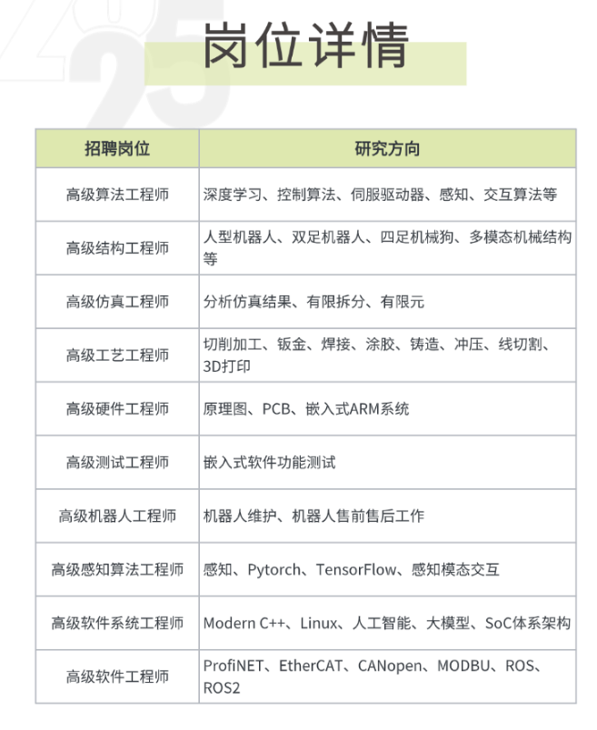 招聘岗位包括高级算法工程师、高级结构工程师等,研究方向涉及深度学习、感知技术、人形机器人、四足机器狗等多个前沿领域。