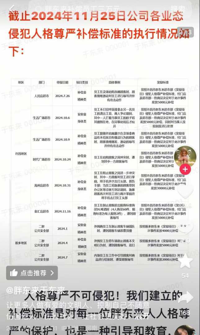 同日,于东来还发布了胖东来人格尊严补偿标准执行公告,鼓励员工在人格尊严受侵犯时,采取法律手段维权,并主动向公司申请补偿。管理层需正确引导,必要时提供专业心理疏导。据公告,员工受侵犯时,补偿金介于2000元至30000元不等,最高补偿案例发生在禹州店超市,金额为30000元。