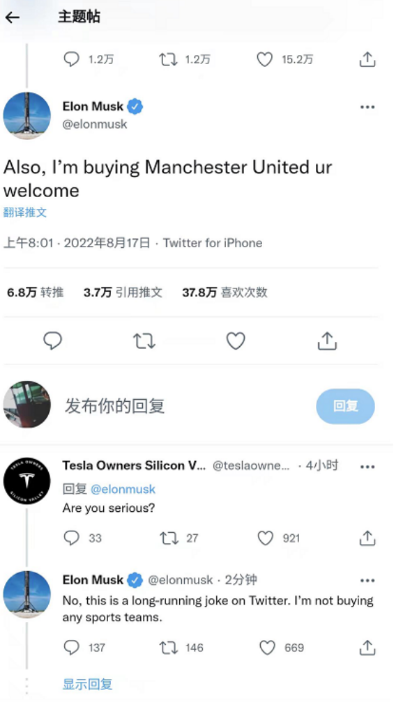 特斯拉CEO马斯克在推特上澄清此前“将购买曼联”的发言,称这只是推特上的一个长期笑话,并没有在购买任何体育队伍的打算,引发了球迷和业内人士的热议。