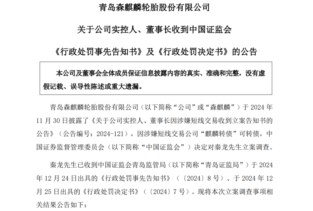 12月25日晚间,森麒麟发布公告,披露公司董事长秦龙因短线交易“麒麟转债”可转债被青岛证监局处罚12万元。据悉,秦龙在卖出“麒麟转债”后六个月内又买入,违反了《中华人民共和国证券法》相关规定。