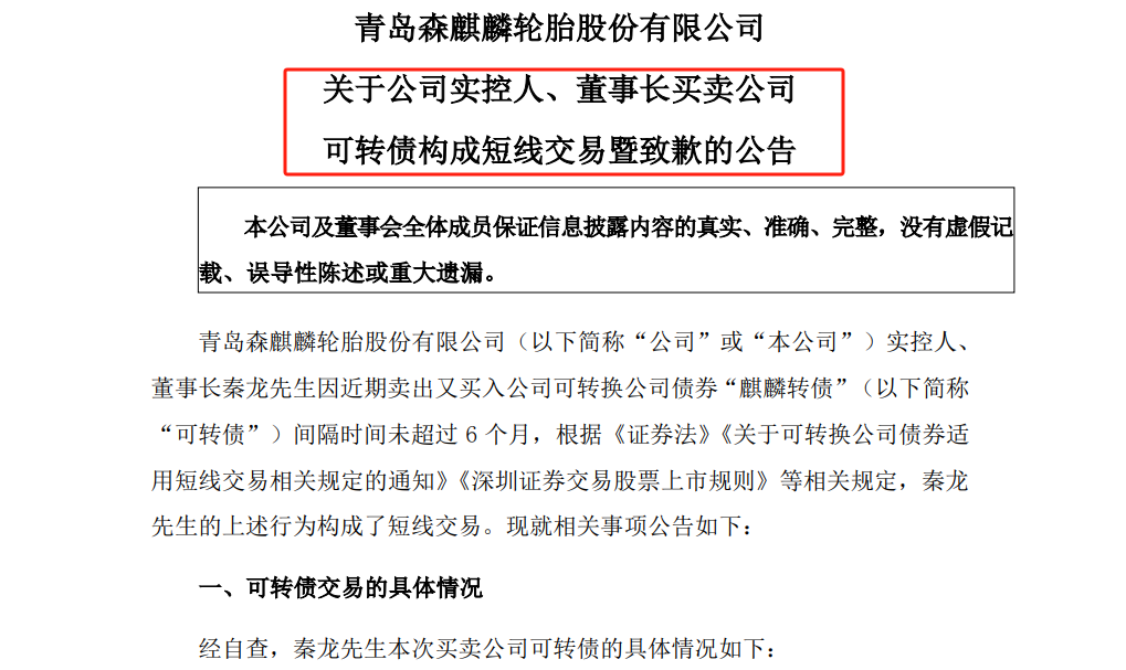森麒麟董事长秦龙因短线交易“麒麟转债”可转债被青岛证监局处罚12万元,公司表示该事项不会对公司正常生产经营产生重大影响。