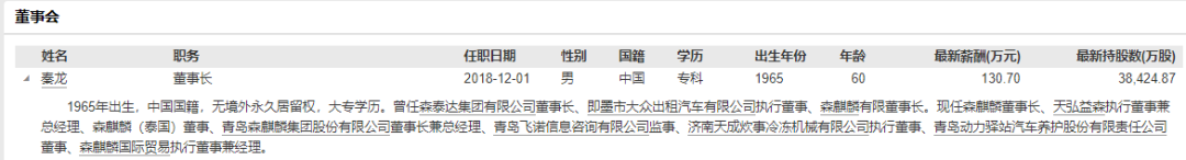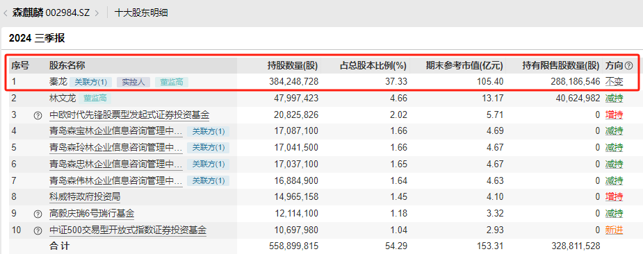 公开资料显示,秦龙现年60岁,大专学历,2023年年薪为130.7万元。截至2024年三季度末,他直接持有森麒麟3.84亿股股份,占股本比例为37.33%,期末参考市值为105.4亿元。
