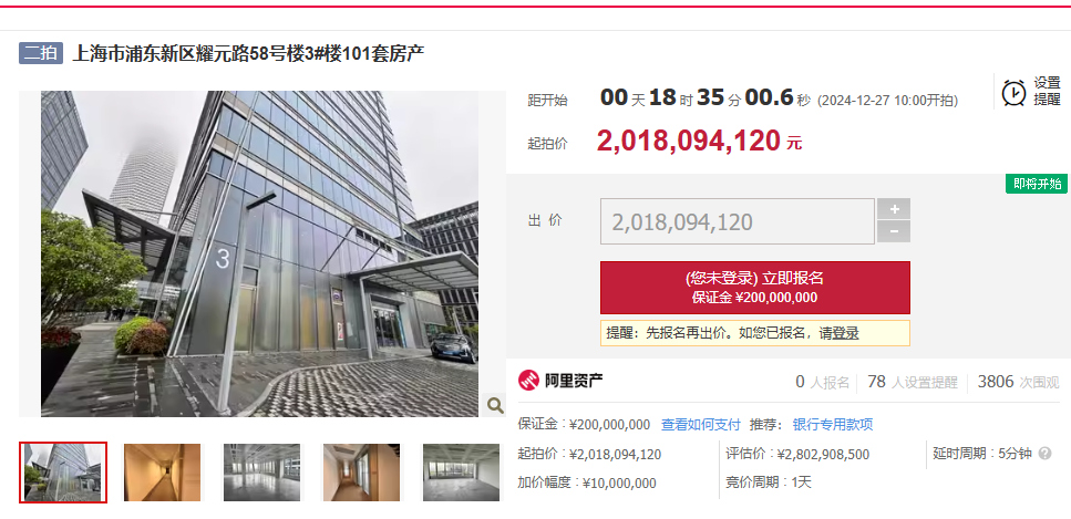 【大河财立方消息】12月26日,据阿里巴巴司法拍卖平台最新消息,上海市浦东新区耀元路58号楼3#楼的101套房产将于次日,即12月27日进行公开拍卖。这批房产的起拍价格高达20.18亿元,资产处置单位为辽宁省大连市中级人民法院。截至消息发布,已有78人对该拍卖项目设置了提醒,吸引了共计3806次的围观,但尚未有人正式报名参与竞拍。