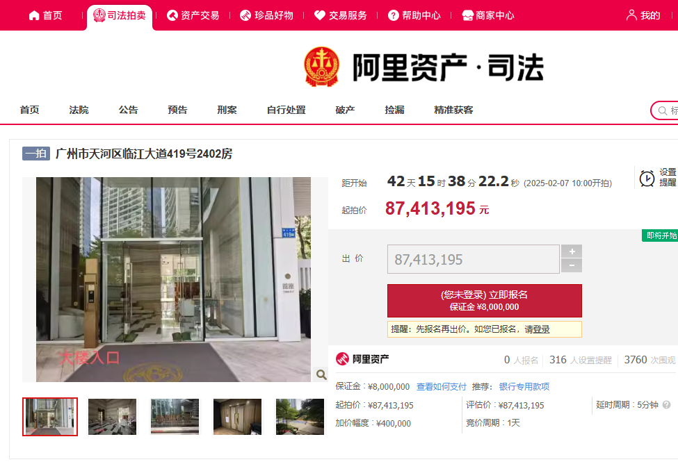 据阿里资产拍卖网信息,位于广州市天河区临江大道419号2402房的豪宅,建筑面积365.8933平方米,专有建筑面积299.884平方米,分摊建筑面积66.0093平方米,折合单价约为23.89万元/平方米。目前该房屋仍有人居住,产权属人为王国安和倪素婷,二人曾为夫妻关系。