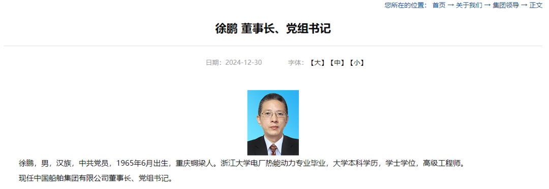 中国船舶集团有限公司宣布徐鹏就任公司董事长及党组书记,徐鹏毕业于浙江大学电厂热能动力专业,是一位中共党员及高级工程师。