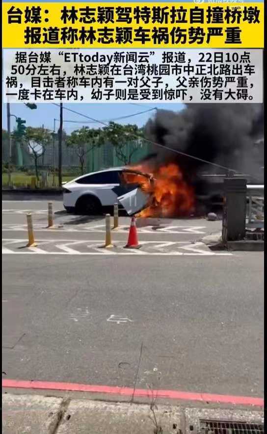 知名艺人林志颖在桃园市芦竹区驾驶特斯拉时撞上道路分隔岛,车辆起火,林志颖及其儿子受伤送医。