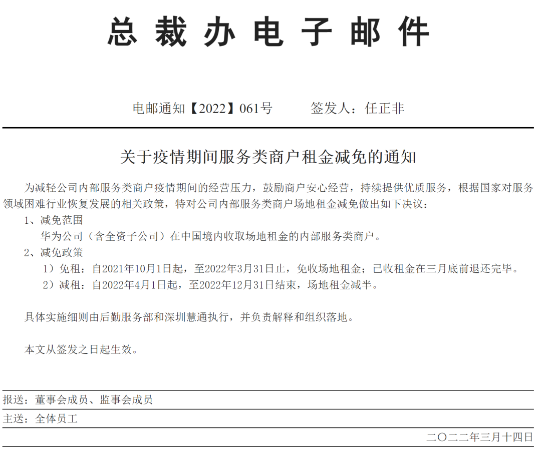 次日,华为总裁任正非迅速响应,签发通知减免内部服务类商户租金。令人瞩目的是,华为不仅免除未来租金,还退还已收取的租金。