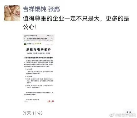 此举一出,餐饮界纷纷点赞,称华为为“中国好业主”。吉祥馄饨创始人张彪表示:“值得尊重的企业一定不只是大,更多的是公心。”
