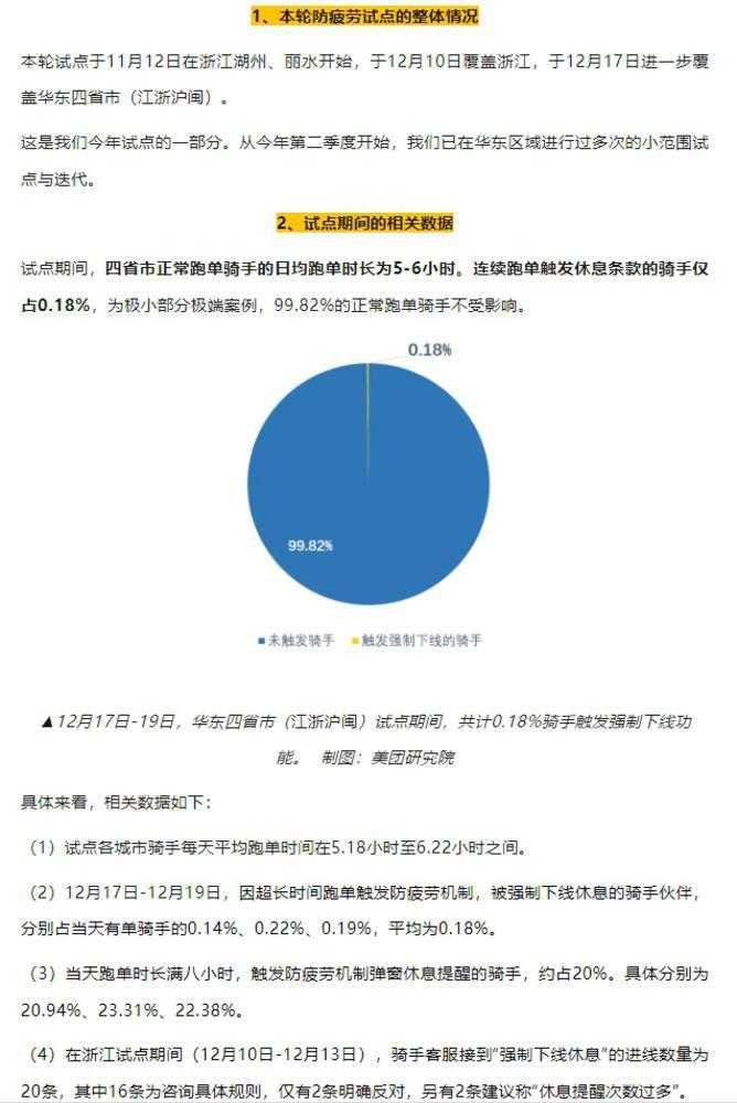 美团最早在四川、广西、浙江等区域进行了防疲劳管理举措的测试,并随后将这一机制拓展至华东地区。与早期相比,本次试点新增了“跑单超过8小时提醒及12小时强制下线”的策略。在试点期间,试点区域的正常跑单骑手日均跑单时长为5-6小时,连续跑单触发休息条款的骑手占比极低,仅为0.18%。