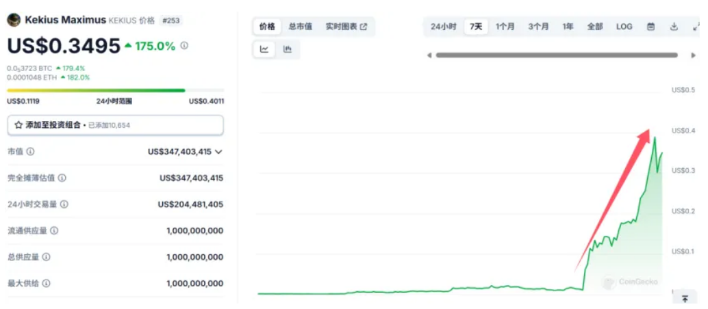 根据CoinGecko平台提供的数据,在马斯克更改昵称之前,Kekius Maximus的价格徘徊在0.0112美元附近。然而,在马斯克更改昵称后,这款模因币的价格开始急剧攀升,2024年12月31日当天就实现了9倍以上的增长。进入2025年1月1日,Kekius Maximus的价格继续上扬,最高达到了0.40美元。目前,Kekius Maximus的价格在0.3495美元附近波动,其总市值已经超过了3.3亿美元,相较于马斯克更新昵称之前,涨幅超过了3000%。